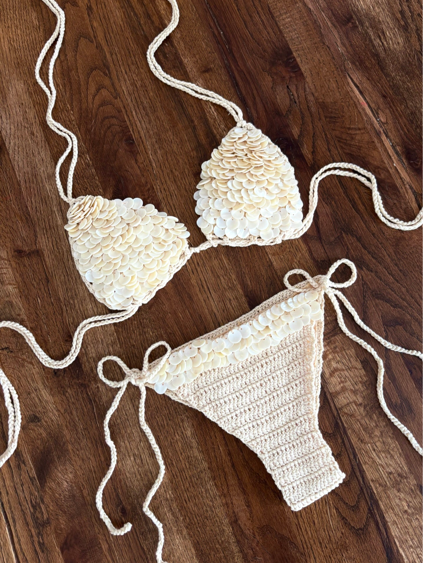 Crochet Mother of Pearl Set. Crochet Bikini With Tie Bottoms, Hand Sewn Mother of Pearl Shells.
